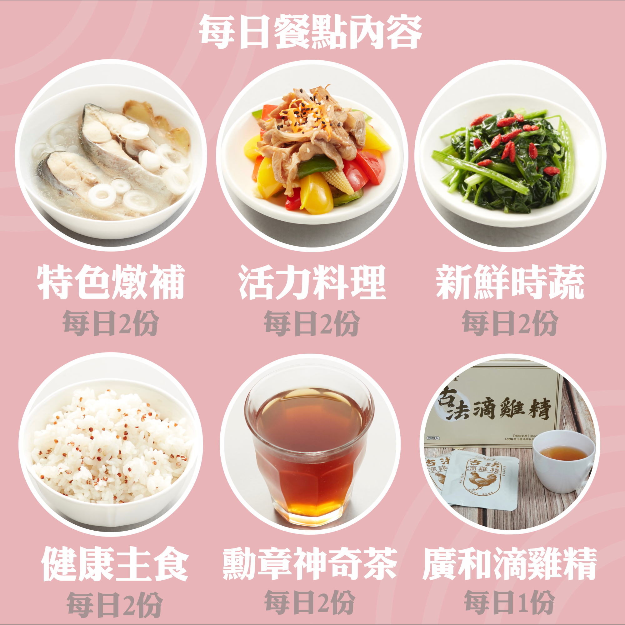 ・特色燉補搭配清爽主菜、新鮮食蔬、各式飯類