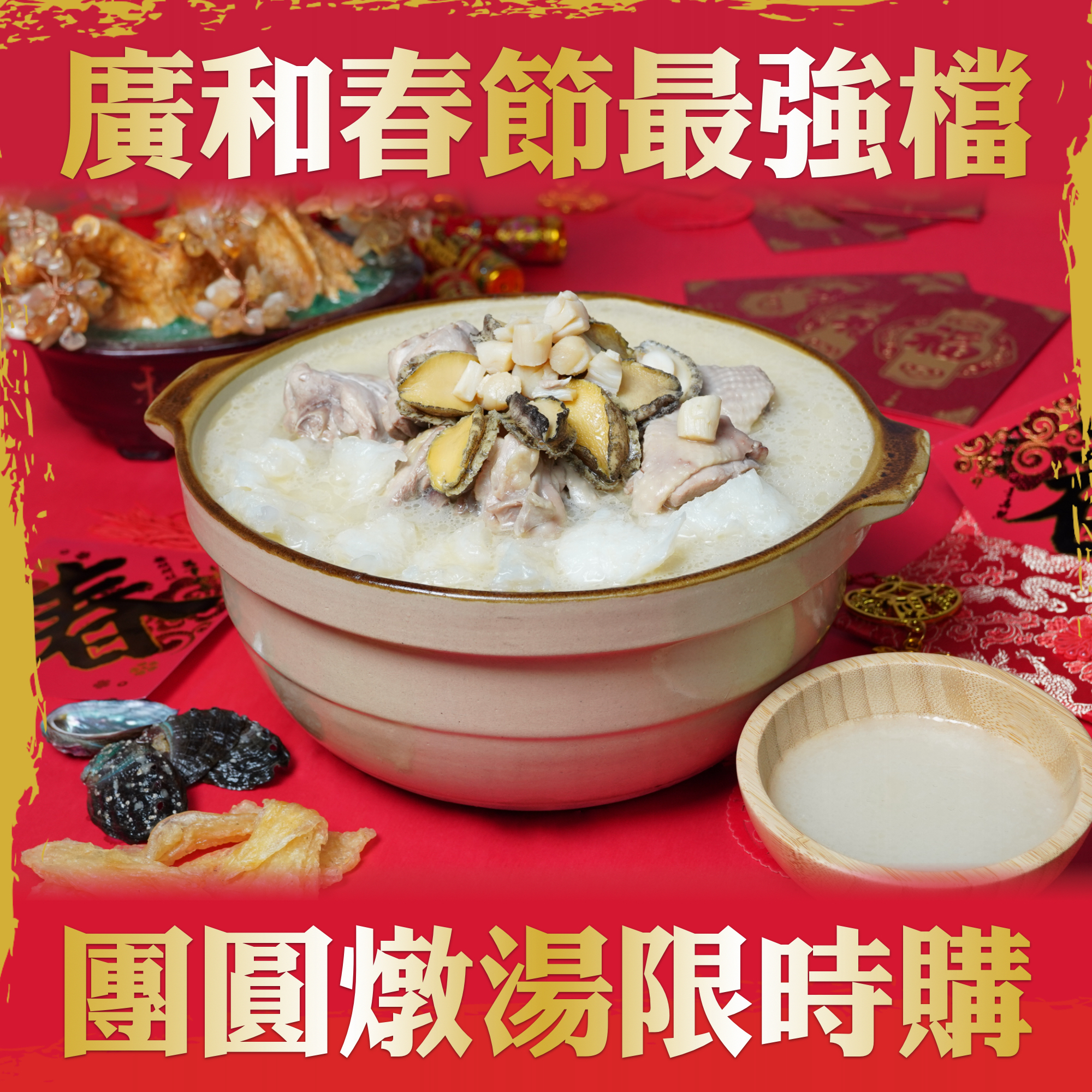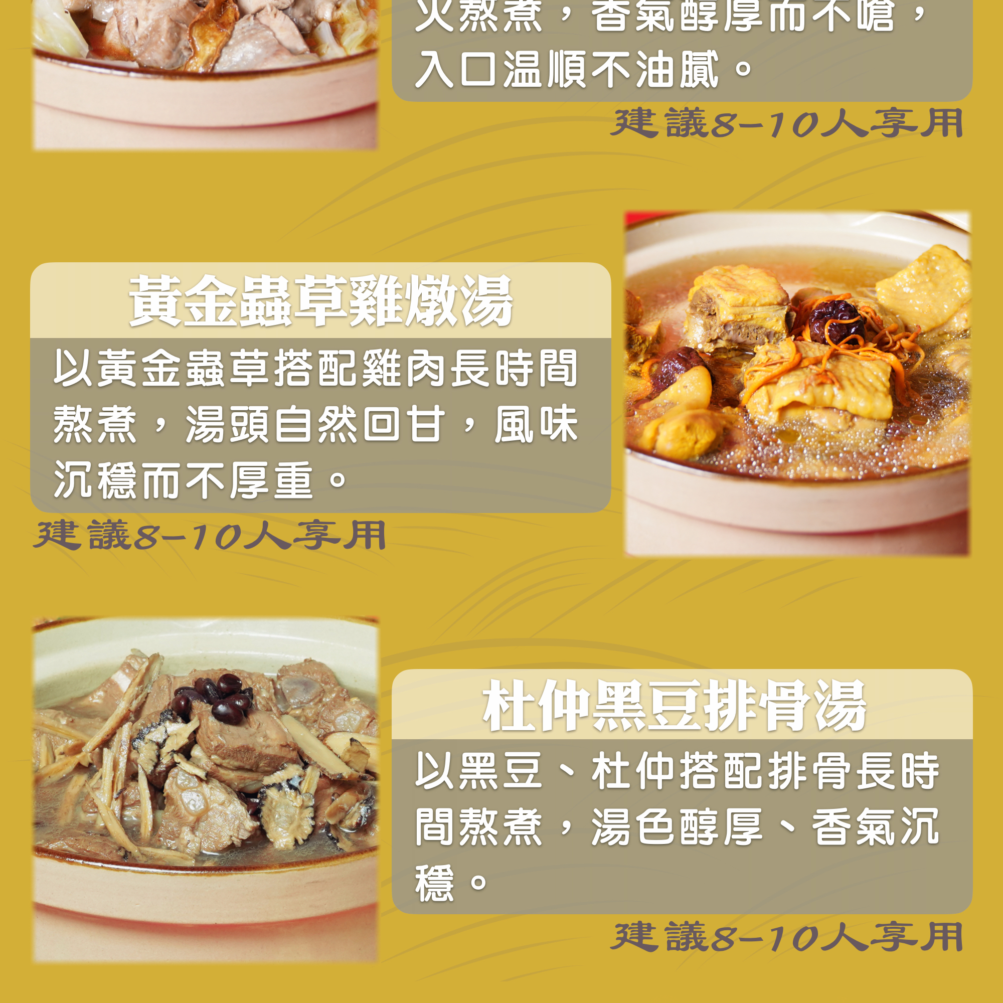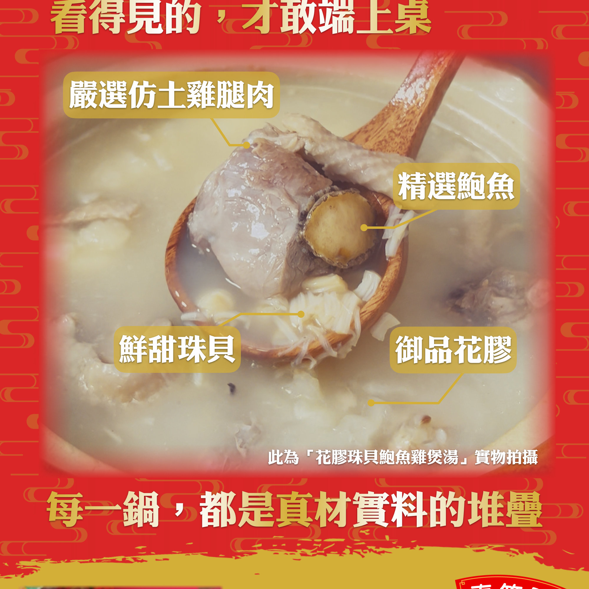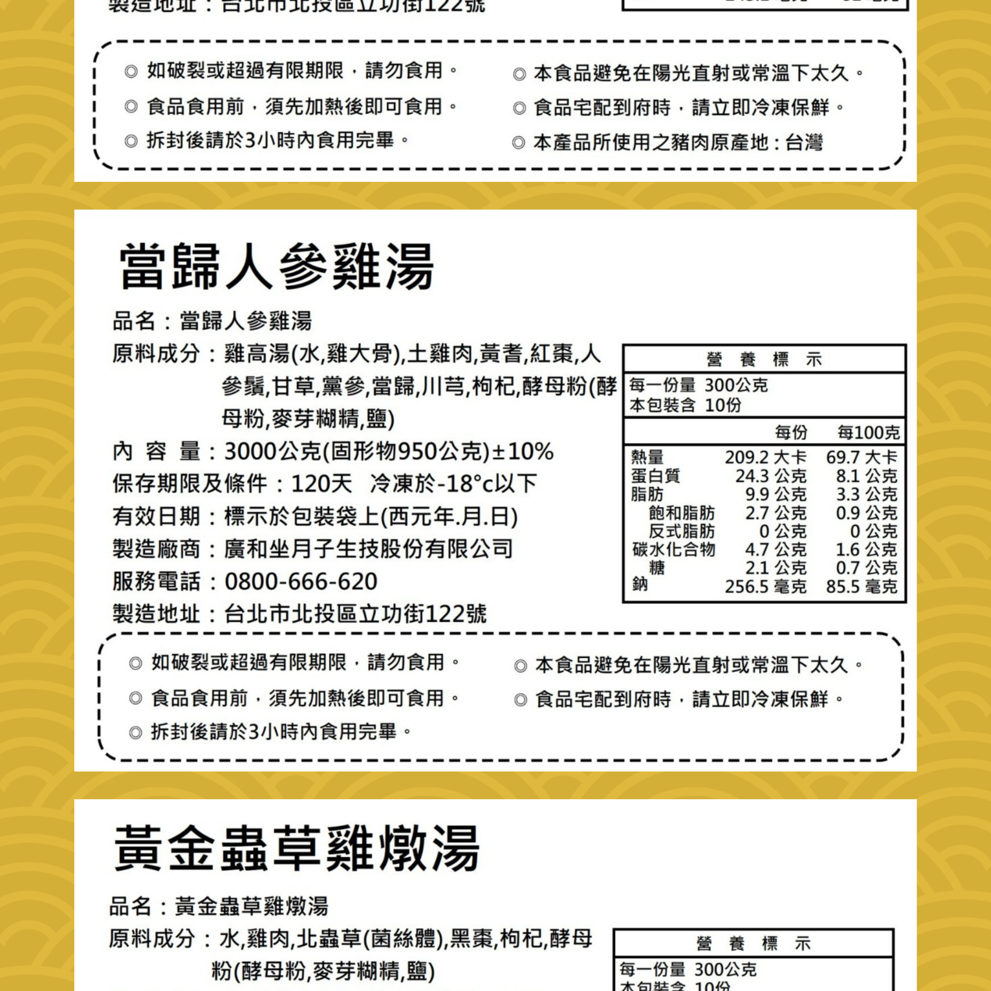 當歸人參與雞肉長時間慢火細燉,湯色澄澈、草本清香。天然無添加,每包±3000g,建議8–10人份,適合年節圍爐或冬日進補。